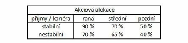 Velice zjednodušující pravidlo. David Blanchett, hlavní analytik Morningstar Investment Management, ho upřesňuje a doporučuje investovat mezi 40 až 90 % do akcií podle stádia kariéry a jistoty výdělku.