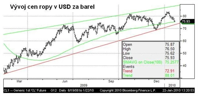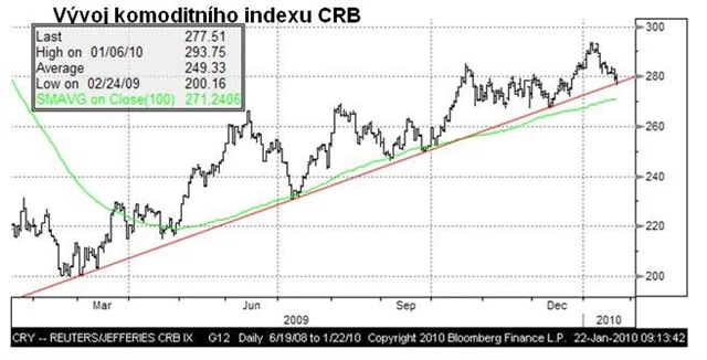 Komoditní index CRB, který dokonce jeden lednový týden vyrostl o 4%, od té doby trpí a dostal se zpět k úrovním, kterých dosahoval v prosinci 2009. Nové long pozice (spekulace na další růst) se tak ocitly pod tlakem. Technicky je rostoucí trend z března 2009 v ohrožení. Další dny proto budou klíčové pro určení dalšího směru vývoje komodit.