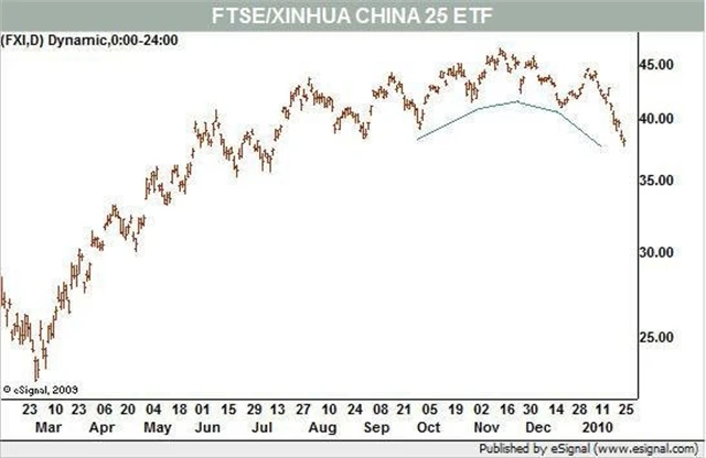 Investoři zaznamenají ještě větší ztrátu v indexovém fondu iShares Trust FTSE/Xinhua China 25 Index Fund. Ten podle technické analýzy zažívá tzv. "okrouhlý vrchol".