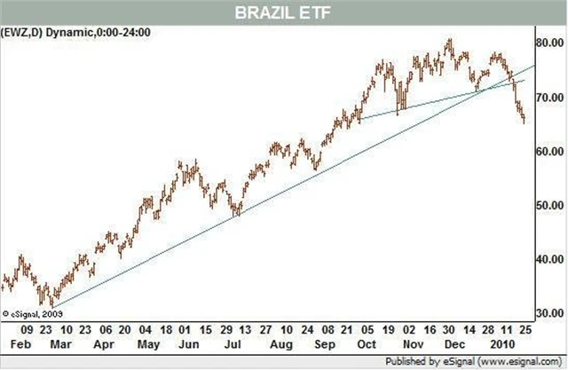 Podle grafu se zdá v tuto chvíli slabý také indexový fond iShares MSCI Brazil Index Fund. Ačkoli je stále nad hranicí 200denního klouzavého průměru, průlom býčí trendové linie z března je jasný.