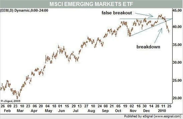 Obecně tyto signály technické analýzy nevěstí nic dobrého ani pro ostatní rozvíjející se trhy. iShares MSCI Emerging Markets Index Fund zaznamenal minulý měsíc falešné proražení rezistence a v tomto měsíci proražení trendové čáry.