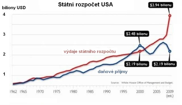 Budeme vycházet z přiložených grafů. První ukazuje, jak se vyvíjely příjmy a výdaje státního rozpočtu Spojených států. Umíte si představit, samozřejmě po seškrtání několika nul, že by nějak podobně fungovala vaše domácnost? I kdyby u vás doma držel kasu váš kokrŠpaněl, nebudete se při pohledu na graf smát.