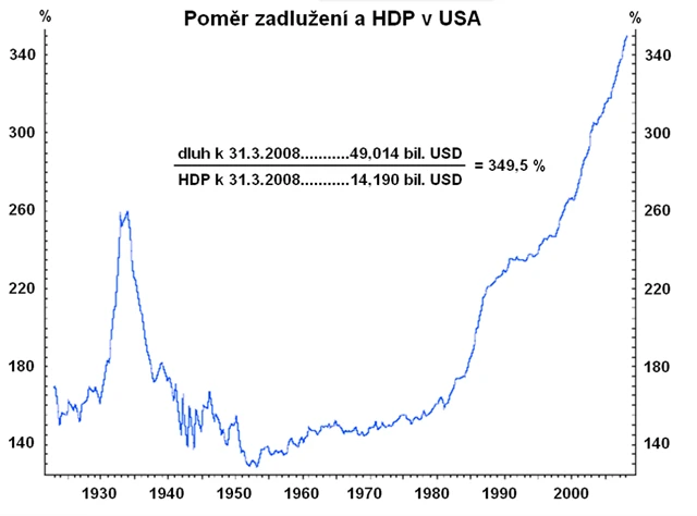 Druhý graf ukazuje, jak se vyvíjel poměr zadlužení Spojených států k jejich hrubému domácímu produktu. Menší vrchol v jeho levé části sleduje reakci americké ekonomiky na Velkou depresi. Trvalo 10 let, než se zadlužení podařilo zkrotit. Ten mírně řečeno vyšší vrchol v pravé části vede až k současné situaci. Chytrá horákyně mezi filmovými kritiky by podobnou zápletku možná popsala slovy "docela horor".
