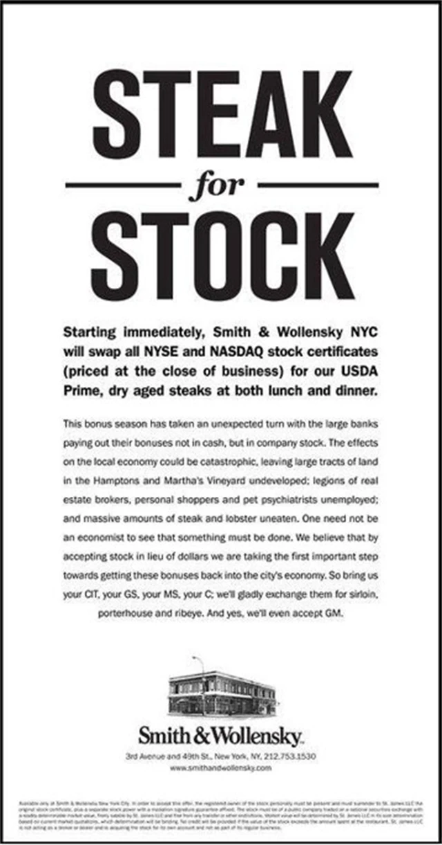Americká veřejnost se za poslední rok seznámila s mnoha novými ekonomickými pojmy. V roce 2010 může do slovníčku zařadit další – steak za akcie. Legendární steak house Smith & Wollensky totiž představil novou možnost platby za konzumaci. Reaguje tak na zprávu, že by se tento rok měly na Wall Street vyplácet bonusy v akciích, a ne v penězích, jak tomu až doposud bylo.
