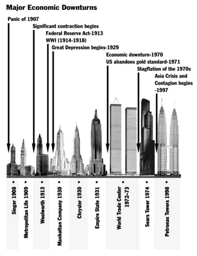 V roce 2005 stanovil ekonom Mark Thorton teorii. Podle ní termíny dokončení velkých mrakodrapů, symbolů lidské pýchy a bohatství, v podstatě předznamenávají příchod ekonomické recese.