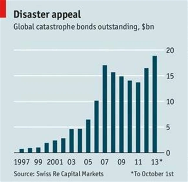 V poslední dekádě bylo emitováno přes 40 miliard USD cat bondů, z toho 19 miliard USD je před splatností. Stále je to ale jen zlomek z 300 miliard USD v teoretických platbách, které pojišťovnám hrozí v souvislosti s přírodními katastrofami. I tak je ale současná situace nesrovnatelná se 4miliardovým trhem cat bondů před deseti lety. Číslo se navíc podle Bank of New York Mellon může v následujících letech zečtyřnásobit.
