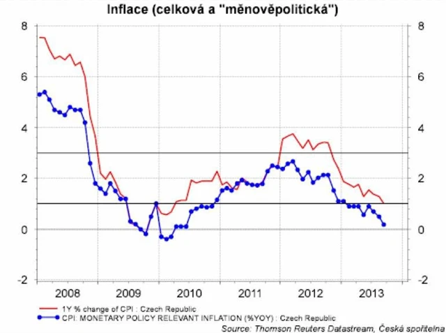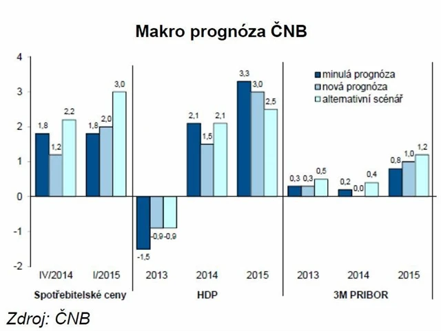 ČNB zveřejnila dvě prognózy - takzvaný základní scénář a alternativu. Základní scénář ČNB předpokládá návrat inflace do cílovaného pásma ve třetím čtvrtletí 2014 a na cíl 2 % na začátku roku 2015 při růstu ekonomiky v příštím roce o 1,5 %. Nicméně tento základní scénář předpokládá, že tříměsíční mezibankovní sazba (3M PRIBOR) poklesne na začátku příštího roku do záporných hodnot (-0,5 %). Teoreticky může ČNB snížit svou repo sazbu do záporu, ale jak již bylo řečeno, nechce se zápornými sazbami experimentovat. Navíc tržní sazby nemusejí tento pokles reflektovat.