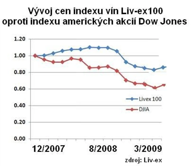 Zajímavý je,ale pohled na kratší časový úsek vývoje neoficiálního indexu výkonnosti 100 nejlepších lahví Liv-ex 100 v porovnání s vývojem amerických akcií (index Dow Jones). Světovou ekonomickou krizi snáší vinné investice zatím velmi statečně.