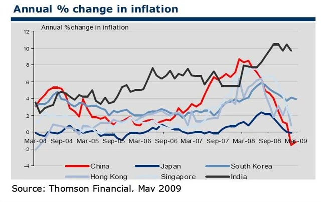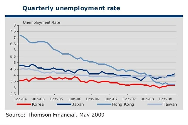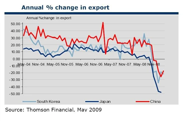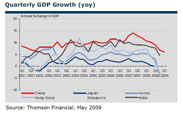 Japonsko na konci roku šokovalo svět. Anualizovaný pokles HDP za čtvrté čtvrtletí 2008 byl 12,1%, zejména kvůli oslabení exportu. V prvním čtvrtletí roku 2009 nastala v Japonsku hluboká deprese, kdy HDP oslabil o 3%. Významně poklesla osobní spotřeba a kapitálové investice, a to nejvýrazněji od druhé světové války a ropné krize v 70. letech. Japonská vláda oznámila v dubnu 2009 plán ekonomických stimulů, jež by měly zvýšit HDP země o 2% ještě během roku 2009.