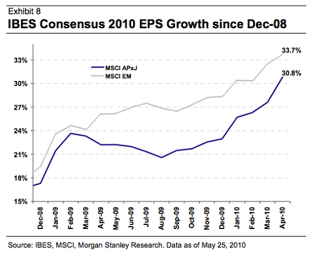 Jejich býčí argumenty se opírají například o výhled růstu firemních zisků na akcii (EPS) na vyspělých trzích (MSCI ApxJ pozn. bez Japonska) a mladých trzích (MSCI EM). Růstový trend vývoje zisků, který ilustruje graf, nezměnily v posledních dvou měsících ani úvěrové problémy v Evropě, nebo fiskální utahování v Číně.