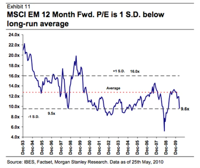 Růst zisků na akcii s sebou také přinesl pokles poměrového ukazatele P/E (kurz/čistý zisk) u akcií z mladých trhů na historicky velmi nízké úrovně.