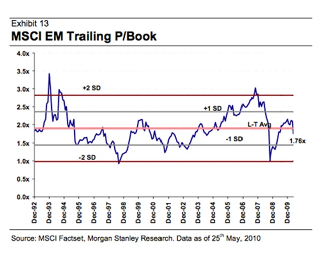 Dalším ukazatelem, který potvrzuje historicky příznivé ocenění mladých trhů, je poměr tržní ceny vůči účetní hodnotě - tzv. price/book value.
