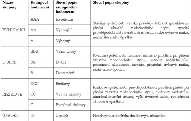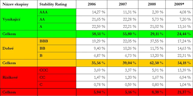 Zatímco v roce 2006 jsme 58,5 % společností hodnotili jako "vynikající" některým z ratingových stupňů A, v roce 2009 jich byla již méně než čtvrtina. Naopak, z 35,6 % v roce 2006 na 54,2 % v roce 2009 se rozrostlo množství "dobrých" firem s ratingem v kategorii od BBB po B. Alarmující je výrazné zvýšení podílu "rizikových" firem s ratingem C z 5,9 % v roce 2006 na 21,4 % v roce 2009. To znamená, že každá pátá společnost podnikající v ČR je ohrožena krachem.
