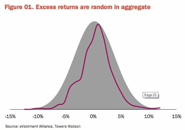 Graf ukazuje očekávané výnosy (šedá oblast) za předpokladu, že jsou generovány náhodně a mají normální rozdělení. Fialová křivka ukazuje skutečné rozdělení výnosů u fondů s velkou kapitalizací v posledních třech letech. Vidíme, že výnosy jsou náhodně rozděleny s průměrným výnosem mírně nad 0 %.