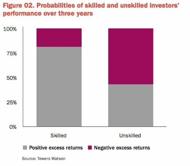 Graf ukazuje pravděpodobnost, že zkušený manažer (s čistým informačním poměrem 0,5) a nezkušený manažer (s čistým informačním poměrem -0,1) porazí trh během tříletého období. Přestože má začátečník mnohem nižší šanci uspět, stále má 43% pravděpodobnost, že se mu podaří trh překonat.