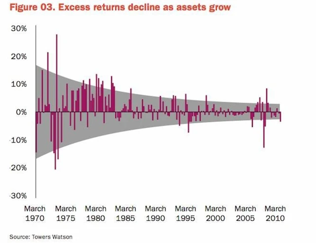 Graf zachycuje výnosy z portfolia jednoho z velkých amerických podílových fondů. Velikost portfolia fondu se dostala na vrchol 100 miliard USD v prvních letech nového tisíciletí. Od té doby se portfolio začalo zmenšovat. Zároveň s tím začaly růst i výkyvy ve výnosech.