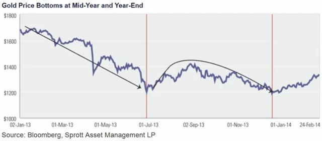 "Pokud připustíme, že k manipulacím docházelo, musíme se logicky zeptat, co bylo cílem obchodníků," říká Sprott. "Podle mého názoru je zřejmé, že jejich snahou bylo to, aby cena kovu v příhodných okamžicích spadla co možná nejníže. Jak si lze jinak vysvětlit, že loni na svá lokální minima cena zlata narazila 27. června a 19. prosince, tedy v polovině a na konci roku, kdy banky rozhodují o odměnách pro své obchodníky?"