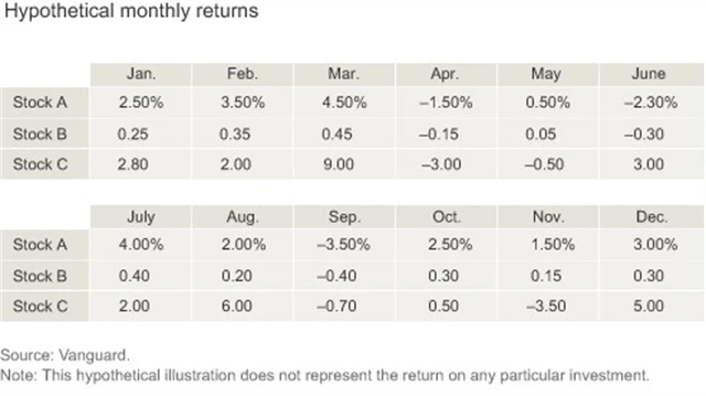 Korelovaněji působí vztah akcií A a C z druhého grafu. Ve skutečnosti je ale korelace akcií A a B dokonalá (1,00), zatímco mezi A a C je pozte 0,52. První graf je příkladem dvou stejným směrem se vyvíjejících cen, míra změny je ale u akcie A vyšší než u B.