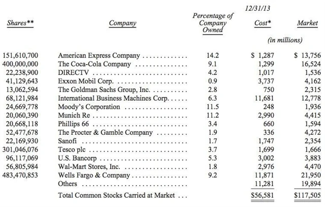 Buffett miluje své akciové pozice a akumuluje je v silných amerických firmách, jako jsou Wells Fargo, Coca-Cola, IBM a American Express, přestože nad nimi nemá takovou kontrolu jako nad podniky, které plně vlastní.