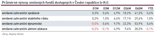 Uzavřít měsíc s kladným výsledkem se podařilo jen polovině smíšených fondů. Rozdíly nebyly velké. Fondy s vyváženou investiční strategií vydělaly průměrně 0,3 % a fondy stabilního růstu 0,2 %. Nejvyššího zisku (+1,5 %) dosáhlo Konzervatívne portfólio o.p.f. A (Acc) (EUR). Fondy s dynamickou strategií a aktivní alokací ztrácely v jednotlivých případech 0,04 % a 0,2 %. V minulém měsíci se nejhůře vedlo fondům KD Prosperita, o.p.f. A (Acc) (EUR) a WPP - Global Strategy Risk 14% Portfolio - Class A (Acc) (CZK), jejichž ztráta dosáhla 3 %.