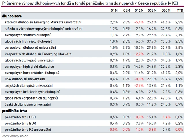 Ve srovnání s tím o něco hůře dopadly fondy, které investují na tuzemském dluhopisovém trhu. Ty rostly průměrně o 0,3 %. Mezi nimi byl nejziskovější investiční fond Conseq Invest – Bond Fund B (Acc) (CZK), který získal 0,6 %.