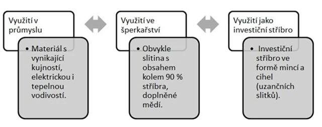 **Tři způsoby využití stříbra. Využití v průmyslu vytváří velkou poptávku (uvádí se až polovina roční produkce), dále kov využíváme pro klenotnické účely a jako hmotnou investici.