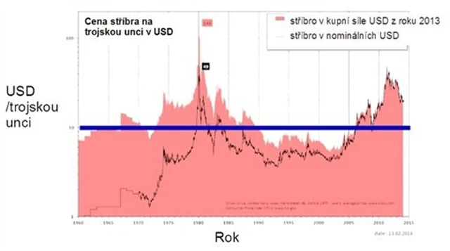 Modrá polopřímka zachycuje to, že cena vyjádřená v reálné kupní síle dolaru z roku 2013 se historicky pohybovala kolem 10 USD za trojskou unci. Z grafu vývoje ceny stříbra je zřejmé, že cena stříbra nejednou vzrostla a spadla. Zjevné jsou vrcholy dvou spekulačních bublin - jeden v roce 1980 a druhý v roce 2011.