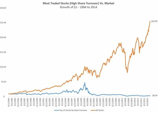Graf znázorňuje historické výsledky strategie, jejímž cílem bylo nakupovat 25 akcií na základě akciového obratu (s klouzavým ročním rebalancováním). Tato skupina nejvíce obchodovaných akcií nabízela roční výnos -3,1 % od roku 1984. Je to smutný obrázek v porovnání s portfoliem se všemi akciemi indexu o stejných vahách, které dosáhlo za totožnou periodu 11,4% výnosu.