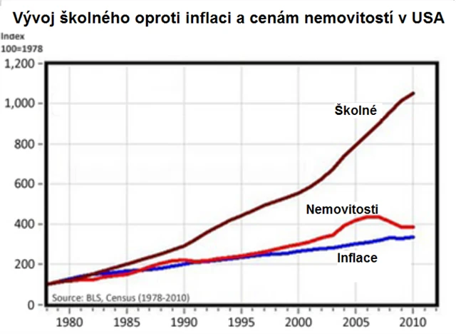 Bublina na akciích. Bublina na dluhopisech. Bublina na komoditách. Bublina na měnách. Všechny tady už byly, ale jedna další netradiční je možná před námi. Ceny studijních programů letí do závratných výšin a již skoro několik desetiletí nekorespondují s vývojem inflace ani cenami dalších aktiv. Alespoň v USA to podle přiloženého grafu tak vypadá.