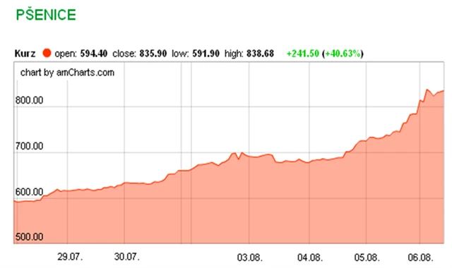 To, co předvádí vývoj kurzu pšenice na komoditní burze, nemá obdoby. Kombinace očekávané špatné úrody z důvodů sucha a požárů v Rusku ji za vydatné podpory spekulantů katapultovala za týden o 40 procent výše.