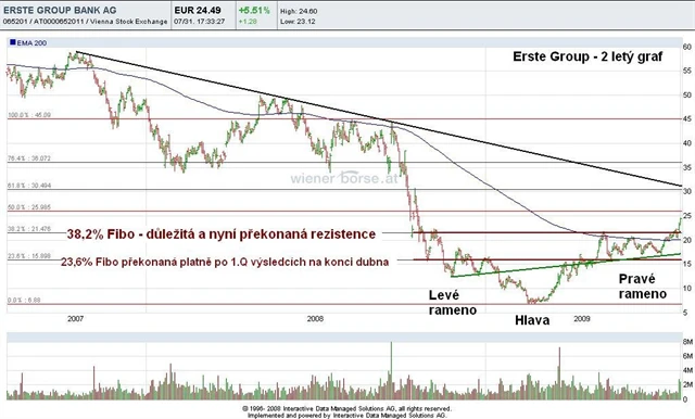 Pojďme se podívat na technickou stránku Erste. Dvouletý graf Erste naznačuje několik věcí. První mě zaujala formace otočená Hlava-ramena, která se nevytvořila pouze na Erste, ale dokonce na některých indexech. Zelená linka je takzvaná „ramenní linie“ celé formace, pod tu by se cena neměla rozhodně dostat, aby formace byla platná. Celá formace dává ve střednědobém výhledu býkům dobré šance.