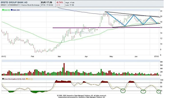 Na obrázku je zřetelný konsolidační trojúhelník a v něm 5 vln. Ideálně by se tedy měla Erste v příštím týdnu odrazit od 17-17,50€ a pokračovat vzhůru proražením horní černé úsečky s cílem okolo 24-25€. Odrazu od současných hladin by nasvědčoval i nákupní signál na Pomalém Stochastickém oscilátoru zeleně zakroužkovaný – dostane-li se do pásma pod 20%, znamená to nákupní signál a dostane-li se nad 80%, znamená to prodejní signál. To neplatí v trendu jako například v březnu, kde se používají jiné ukazatele (Parabolic SAR, MACD.