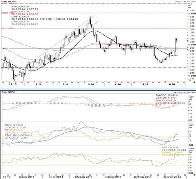 Zlato prudce porazilo hladinu odporu 1 288. MACD se dostala nad nulovou úroveň, obě ROC vzrostly nad nulu a RSI testuje hladinu překoupenosti.