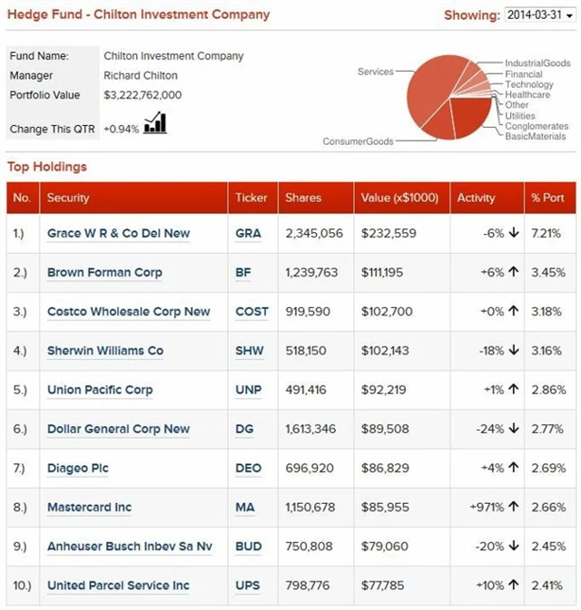 "Specifické na celém byznysu hedgeových fondů je to, že samotný obsah portfolia klienty nezajímá. Investoři se soustředí především na čísla a my se jim v tomto ohledu snažíme vyjít vstříc," dodává Chilton. V současnosti má fond Chilton Investments Company v portfoliu aktiva za více než 3,2 miliardy dolarů s největším podílem cenných papírů společností W. R. Grace & Co., Brown-Forman a Costco Wholesale a mezi investory je prostřednictvím svých pravidelných hlášení pro americkou komisi pro cenné papíry a burzy (SEC) znám jako jeden ze spolehlivých zdrojů informací o aktuálních investičních příležitostech.
