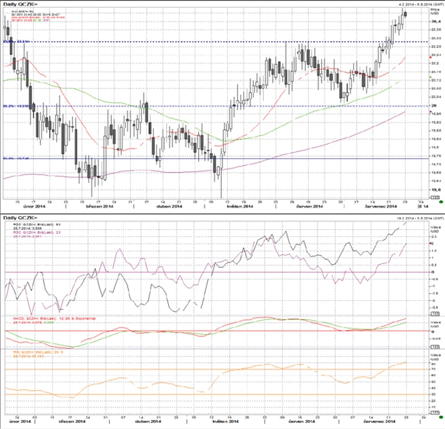 Koruna prorazila hladinu 20,30. MACD je v růstovém trendu nad nulou. Obě ROC jsou v růstovém trendu nad nulou a překoupené. RSI je překoupený. Momentum je prorůstové, ale dolar je zřetelně překoupený, roste tedy riziko korekce.