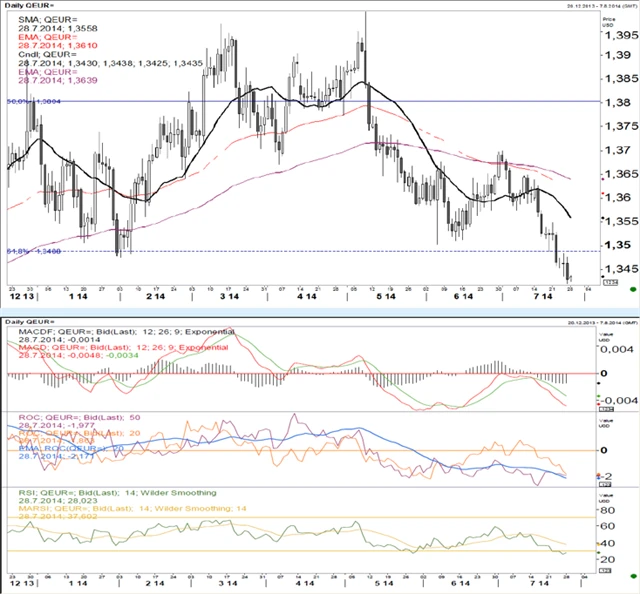 Euro spadlo pod hladinu 1,3488. MACD je přeprodaná v klesajícím trendu pod nulou. ROC20 je přeprodaná a klesá pod nulu, RSI je přeprodaný. Momentum je silně poklesové, ale euro je rovněž silně přeprodané. Bezprostřední prostor pro další pokles eura by měl být omezený, silně vzrostla pravděpodobnost korekce.