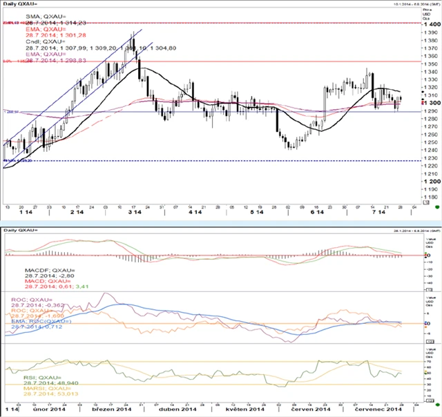 Pokračuje kolísání v konsolidačním pásmu 1 288 až 1 353 USD. MACD mírně klesá a je těsně nad nulou. ROC50 je v postranním trendu blízko nuly, ROC20 v klesajícím trendu těsně pod nulou. RSI kolísá kolem neutrální hladiny 50. Konsolidace patrně ještě nějakou dobu potrvá. Dynamika momenta však stále naznačuje možnost přechodu k poklesu.