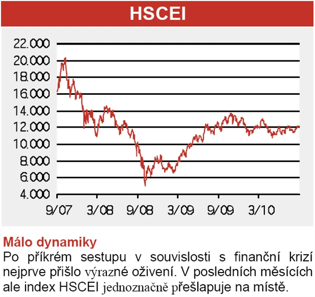 Čínský akciový trh beztak náleží k jasným "underperformerům" minulých měsíců. Z ročního pohledu ztratil index Hang Seng, který zahrnuje 44 největších H-Shares z Hongkongu, asi pět procent. S ukazatelem P/E = 12 je proto trh výhodně oceněn.