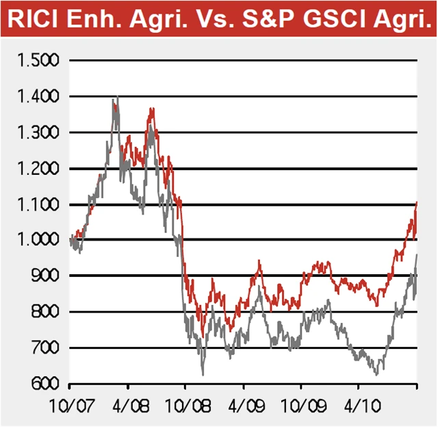 Indexy RICI Enhanced se pokoušejí tento problém rozmělnit tím, že investovaný kapitál řídí pomocí různých dob splatnosti, namísto běžného rolování nejblíže splatného kontraktu. Dlouhodobě se tento postup vyplácí. Index RICI Enhanced Agriculturals TR posílil za poslední tři roky o 11,5 procenta a překonal nejen klasickou variantu (-4,0 procenta), ale i konkurenční index kalkulovaný S&P GSCI (-3,5 procenta).