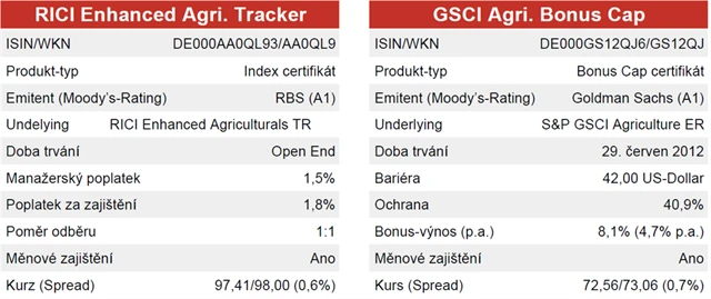 Na jistotu může vsadit investor rovněž prostřednictvím dluhopisového certifikátu Agrar Garant (ISIN DE000BC2EAZ9) emitovaný bankou Barclays. Investoři participují a pozitivním vývoji podkladového koše, který se skládá z pěti agrárních indexů z nabídkové palety GSCI-ER (kukuřice, sojové boby, pšenice, cukr a bavlna). Investiční certifikát se splatností v září 2013 téměř plně garantuje zainvestovaný kapitál. Maximálně lze ztratit 0,7 EUR na jeden certifikát (nákupní kurz: 100,70 EUR). Jediná nevýhoda: výnos při splatnosti bude vypočten zprů-měrováním čtvrtletní výkonnosti. Žádný cap však u tohoto produktu uplatněn není.
