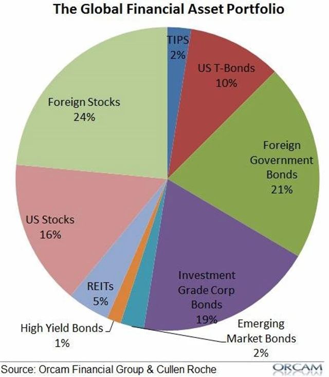 Pokud přeskupíme portfolio podle výše uvedených připomínek, dostaneme zhruba tento koláč Globálního portfolia finančních aktiv (GFAP):