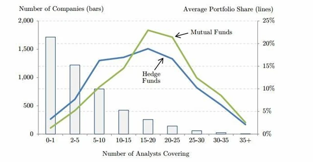 Na závěr Swem zveřejnil graf, který ukazuje, jaké akcie drží hedgeové a podílové fondy podle toho, kolik je pokrývá analytiků. Je jasné, že číslo u obou nejdříve roste a později klesá s růstem počtu analytiků proto, že největší množství firem pokrývá doporučeními mezi 15 a 25 analytiky. Z grafu je však patrné, že hedgeové fondy drží více akcií, které pokrývá menší počet analytiků. Zřejmě právě proto, že mají o firmách a jejich akciích vlastní informace.