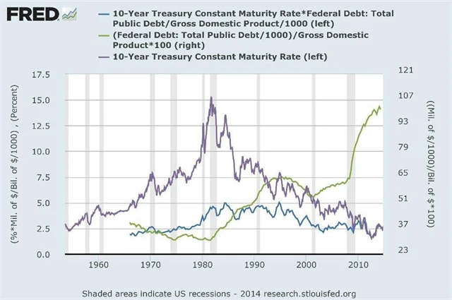 Z výše uvedeného grafu je patrný stabilní pokles úrokových sazeb od konce 70. let. Ve stejném období celkové zadlužení ve vztahu k HDP stoupalo. Inverzní vztah mezi dvěma ukazateli není náhodný, je to nutnost.