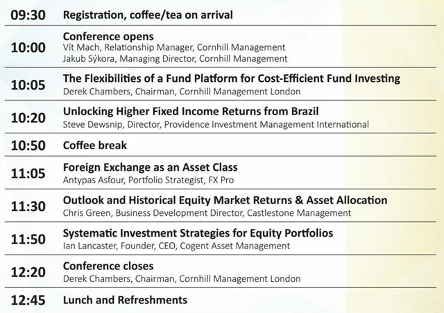 Zajímají vás pevně úročená aktiva, forex, akcie nebo fondy? Společnost Cornhill Management London pořádala v Praze a Bratislavě konferenci právě o těchto tématech. Investiční web pražské vystoupení sledoval živě.