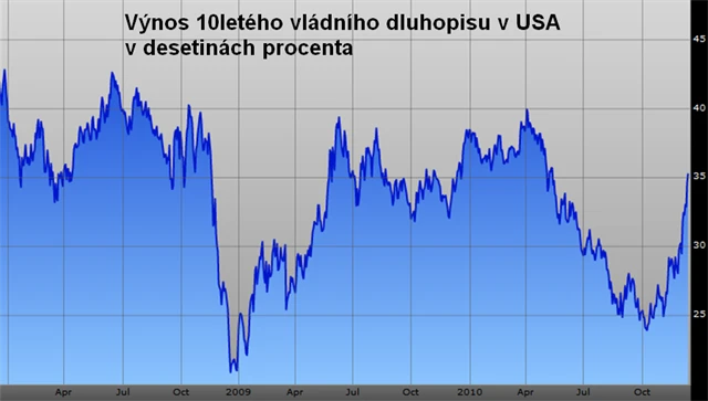 Americké 10leté sazby letí vzhůru a překonaly již hranici 3,5%. Od října výnosy stouply již o celý procentní bod! Od spuštění druhého kola kvantitativního uvolňování (QE2) v objemu 600 miliard USD tyto výnosy rostou. Původní předpoklady byly, že příliv těchto peněz výnosy stabilizuje, případně sníží. Opak se stává pravdou.