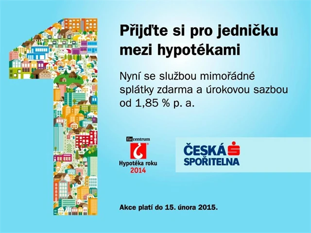 Hypotéka ČS získala ocenění společnosti Fincentrum Hypotéka roku 2014. I v novém roce si Česká spořitelna chce tuto pozici nejen udržet, ale i posílit. Proto až do 15. února nabízí klientům hypotéku se službou Mimořádné splátky zdarma a atraktivní úrokovou sazbou od 1,85 %. Díky této službě mohou klienti skládat mimořádné splátky i v průběhu platnosti fixované úrokové sazby. Limitovanou nabídku České spořitelny mohou využít klienti i k refinancování hypotéky od jiné banky.