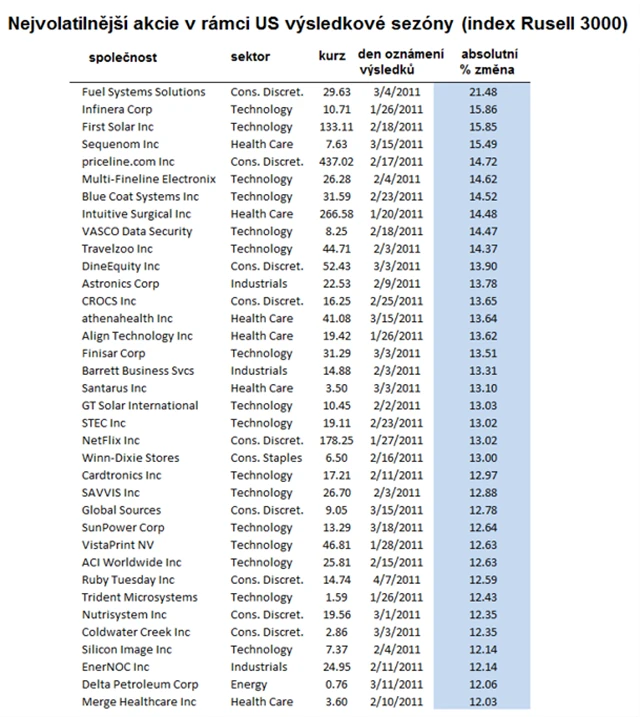 Výsledková sezóna přináší na trh vždy zvýšenou kolísavost. Některé akcie na čtvrtletní výsledky reagují divoce. Analytici ze společnosti Bespoke Investment Group vybírali z databáze společností s již minimálně osmery zveřejněnými kvartálními výsledky a s absolutní odchylkou během výsledkové sezóny průměrně vyšší než 12 procent. Nejvolatilnější jsou akcie z technologické burzy Nasdaq. Žebříčku vévodí firma Fuel Systems Solutions, jejíž akcie během deseti dnů, kdy reportuje svá čísla, "lítají" o plus/minus 21,48 procenta. Také další firmy jako Infinera, First Solar, Sequenom či Priceline zažívají během výsledkové sezóny divokou jízdu.