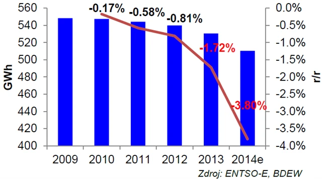 Již jsou známa data o spotřebě elektřiny za loňský rok v České republice i řadě dalších evropských zemí. Čísla potvrzují celkově výrazný propad spotřeby – v ČR mírný pokles o 1,0 %, ve Španělsku o 1,3 %, v největším Německu ale propad o 3,8 % a ve Francii okolo 6 %. Za deset měsíců roku 2014 se celková spotřeba v Evropě snížila o 2,4 %, když propady v Německu a Francii jen částečně vyrovnával růst v hospodářsky se zvedající Velké Británii, v Nizozemsku a v Polsku. Důvodem propadu v Německu byla vedle mírné zimy především klesající aktivita v energeticky náročných odvětvích a pravděpodobně také pokračující zavádění energetických úspor. Poklesy spotřeby navzdory hospodářskému růstu v Německu (20 % kontinentální spotřeby) nejsou rozhodně jednorázovou záležitostí.
