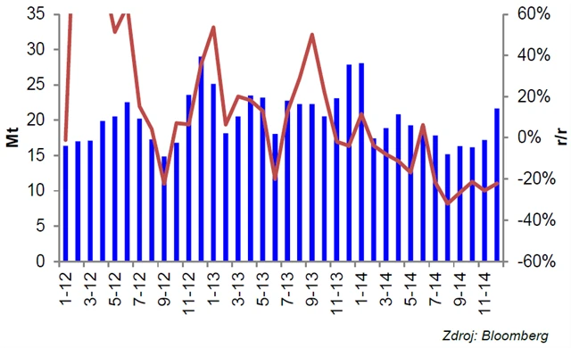 Uhlí je i přes mírné oživení koncem ledna nadále hlavním důvodem pro nízké ceny elektřiny. Na trhu s uhlím je v posledním půlroce nosným tématem pokračující propad čínských importů, který loni téměř vyvážil růst apetitu Indie. Čínské dovozy v prosinci sice sezónně oživily proti listopadu o 26 %, ale meziročně se jednalo o další více než 20% propad (konkrétně o 22 %). Kumulovaně tak čínské importy v roce 2014 klesly o 14,7 % (39 milionů tun). Tento propad byl z velké části vyrovnán 22% nárůstem dovozu energetického uhlí do Indie (+29 milionů tun). Indie je tak v celkovém objemu importu na druhém místě za Čínou (předběhla Japonsko) a v letošním roce by mohla pomoci k pomalému oživené cen této komodity.