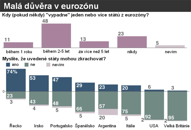Většina světových investorů se domnívá, že minimálně jedna země opustí eurozónu během příštích pěti let. Vyplývá to z výsledků výzkumu, který provedla agentura Bloomberg mezi tisícovkou svých zákazníků, mezi nimiž jsou i největší brokerské domy. Politici by podle nich měli s dluhovou krizí bojovat silnějšími zbraněmi.